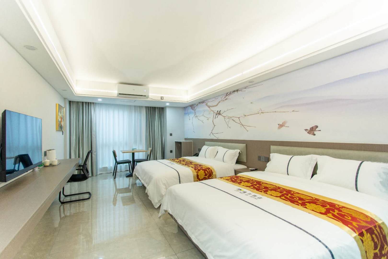 豪华双人房:面积40平方米,配有两张舒适的1.8米大床、高品质的床上用品、独立的卫生间和淋浴间,提供免费的洗漱用品、拖鞋、饮用水、餐桌、办公椅等。房间内还设有液晶电视、冰箱、免费无线网络等设施。